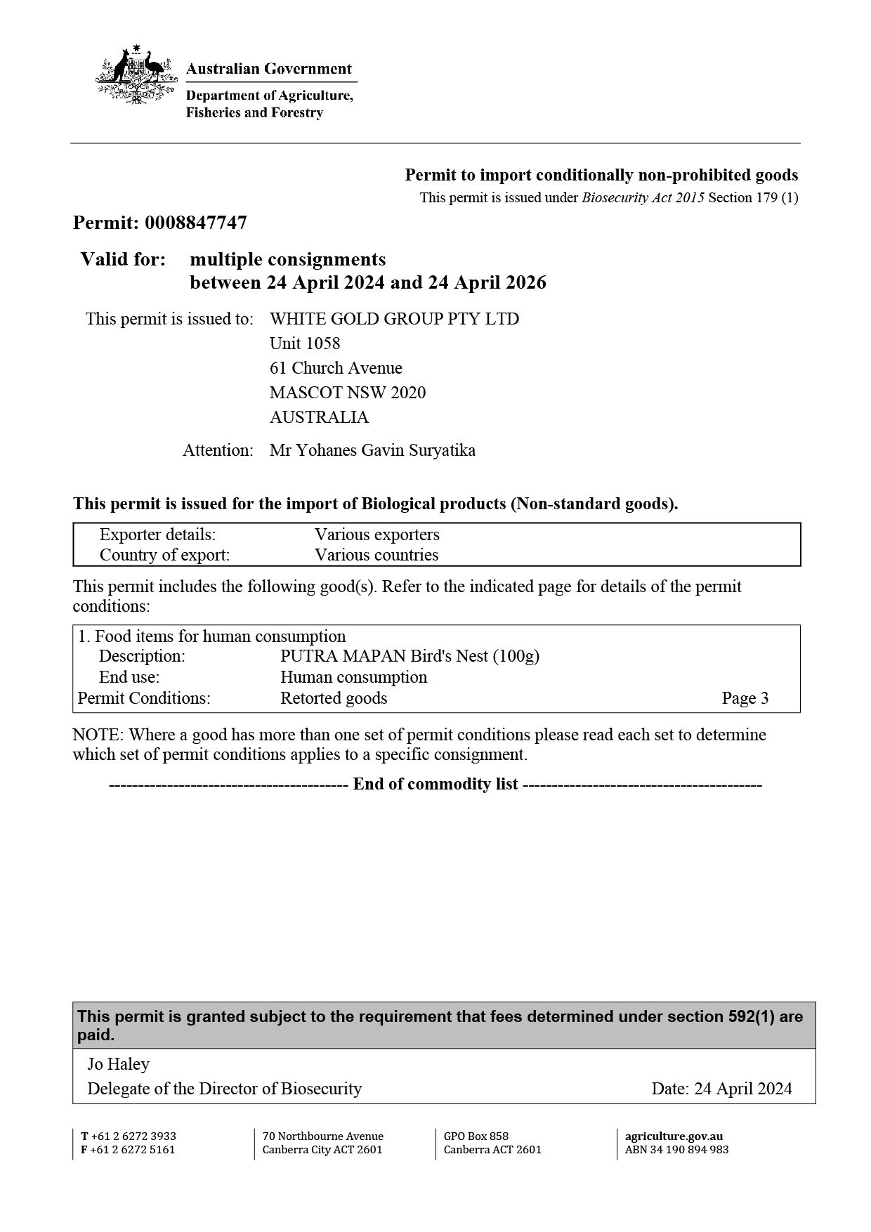 Golden 88 Nest has officially listed as edible bird's nest registered exporter in Trade and Industry